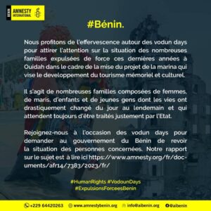 Cotonou , le mercredi 10 janvier – En cette journée marquée par les Vodun Days, Amnesty International saisit l’occasion pour mettre en lumière les expulsions massives de familles à Ouidah par le gouvernement béninois. Ces mesures, entreprises dans le cadre du projet de la marina visant le développement du tourisme mémoriel et culturel, soulèvent une nouvelle fois des inquiétudes quant aux droits fondamentaux des citoyens